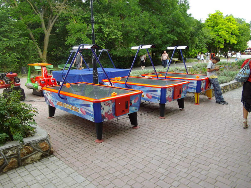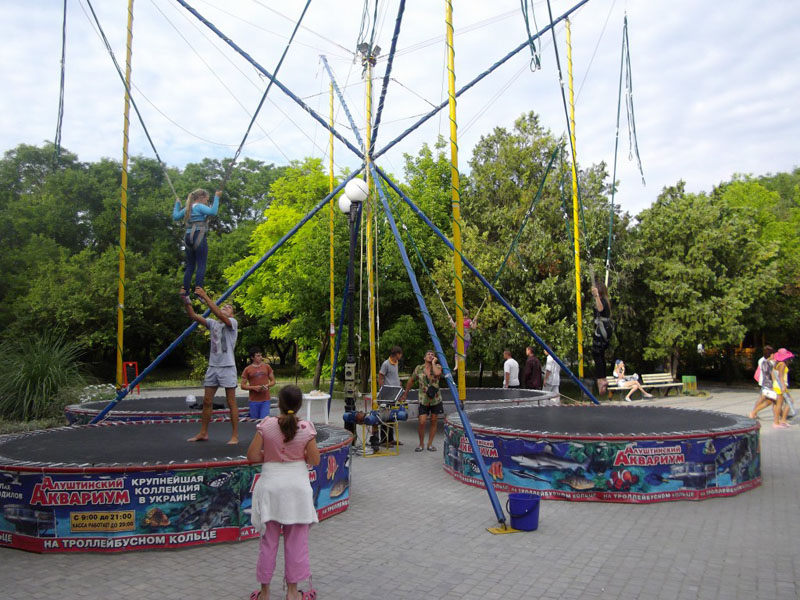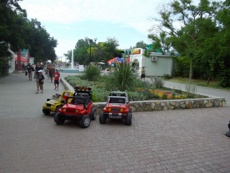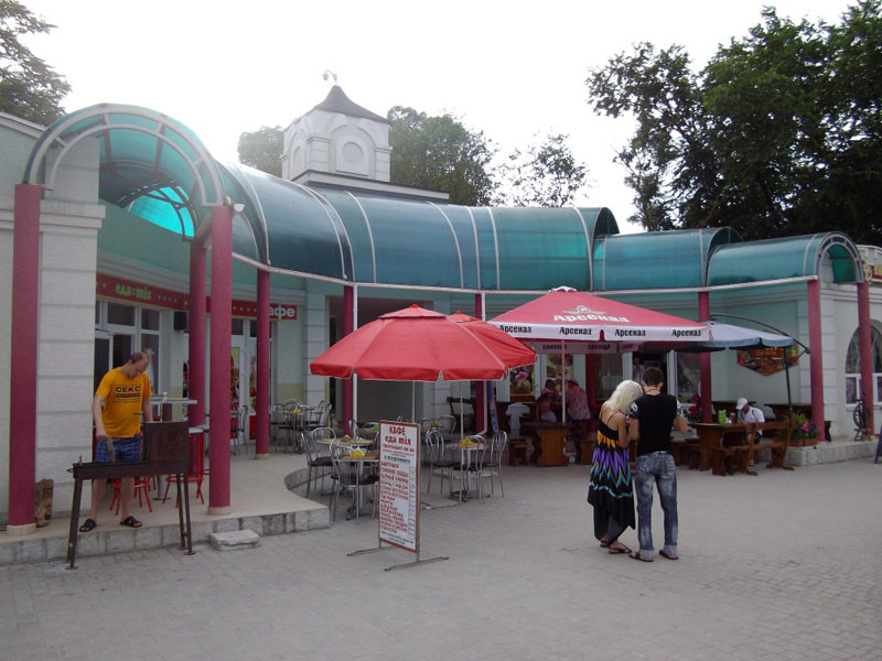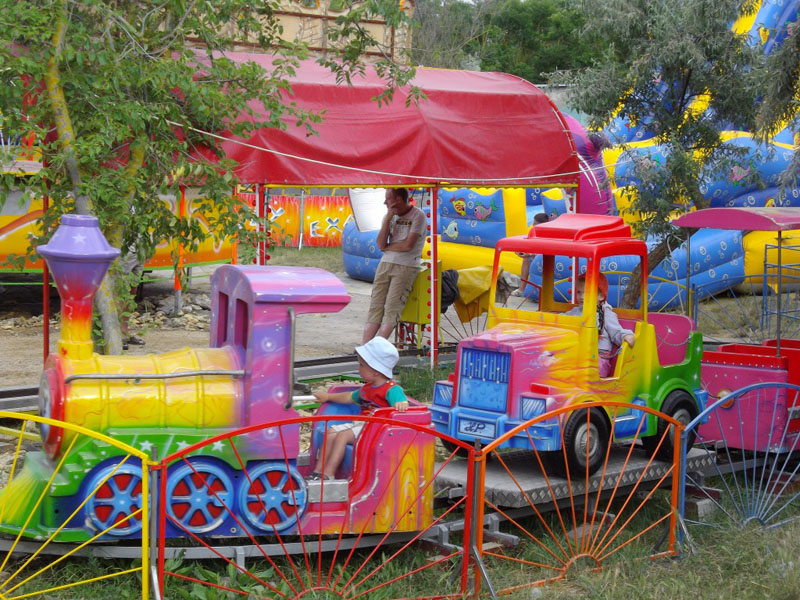 Возле центрального пляжа в Черноморском расположен утопающий в зелени Комсомольский парк с массой кафе и современных аттракционов для детей и взрослых.