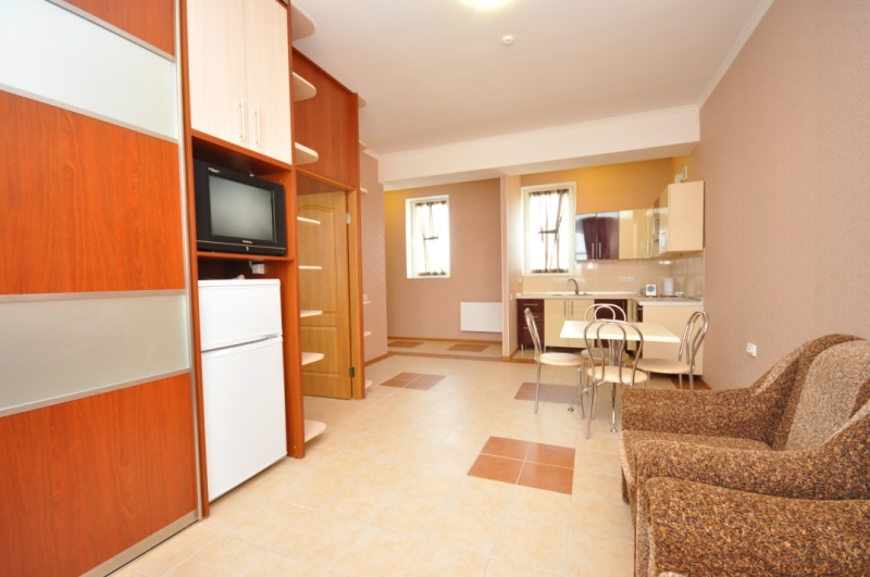 Для семейного отдыха в Черноморском, Крым прекрасно подойдет 2-комнатный номер-студия «Яхонт». В наличии имеется 10 номеров данной категории со всеми необходимыми удобствами.